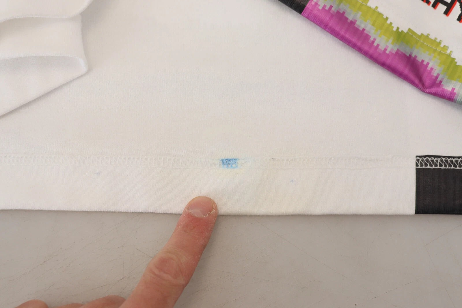 This item has a minor defect, there is a small blue stain on the back bottom (see pictures).